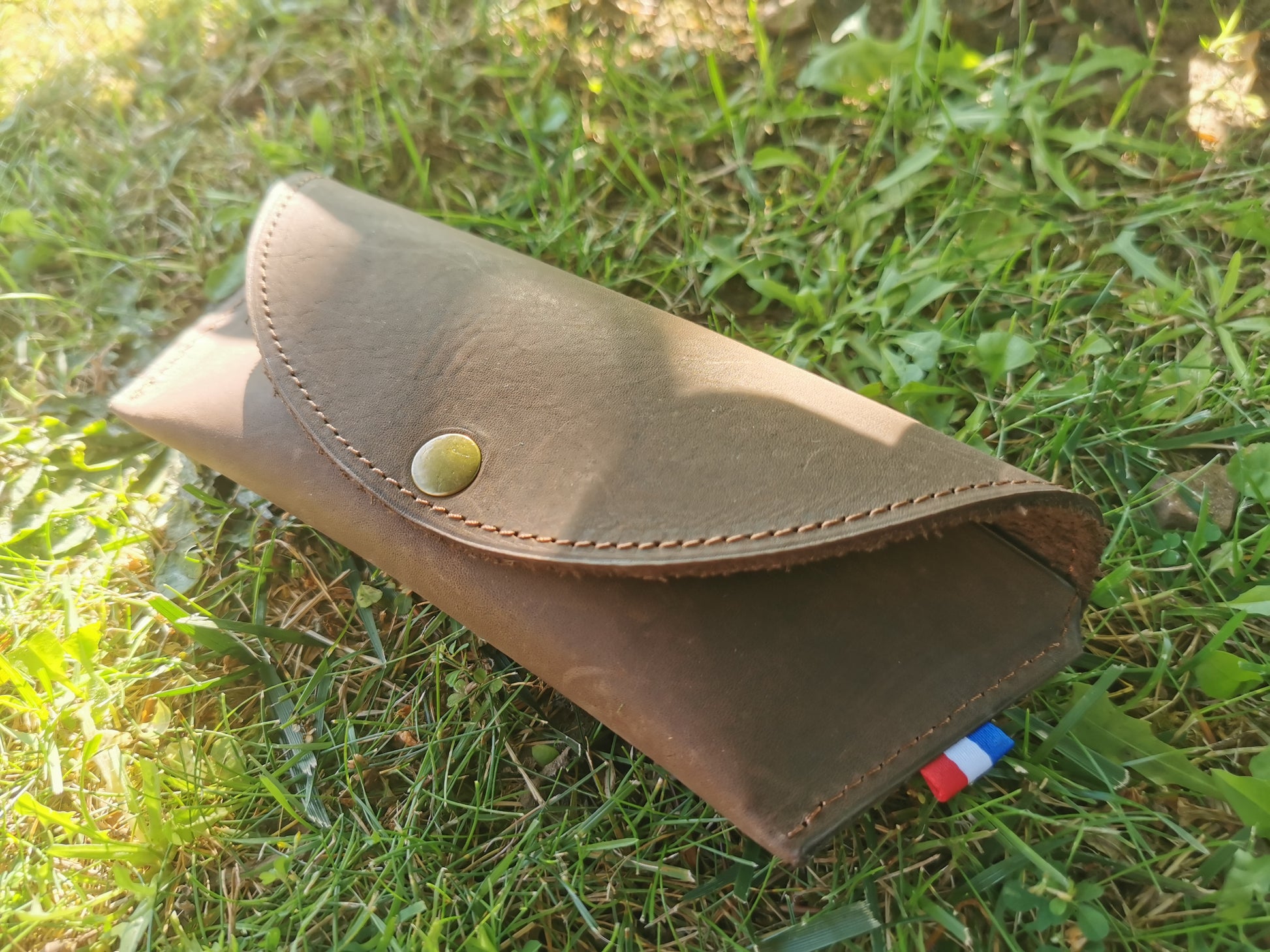 Étui à lunettes rabat arrondi en nubuck au tannage végétal. Cuir style vintage .