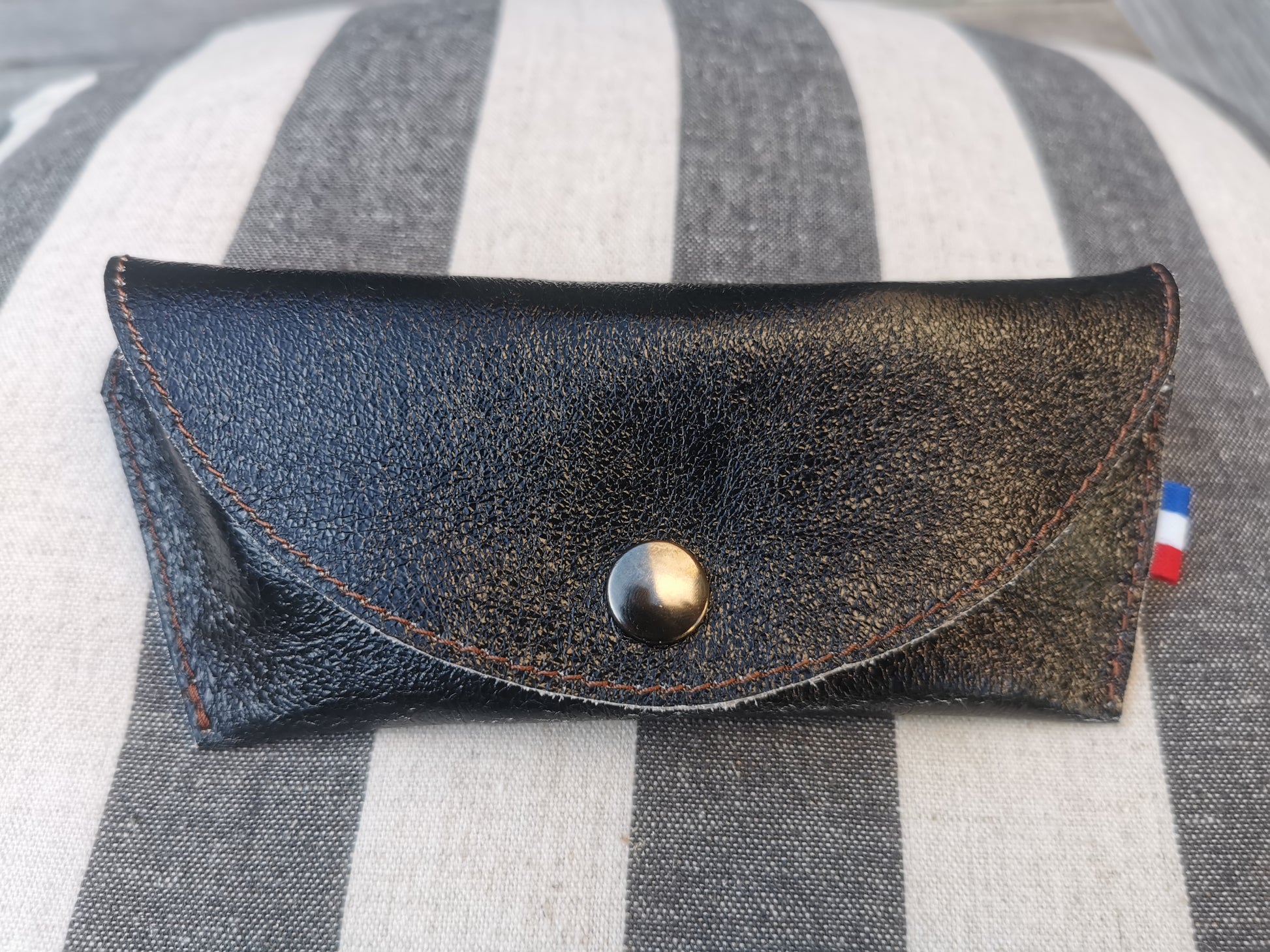 Étuis à lunettes rabat arrondi en croûte de cuir finition noir brillant effet craquelé. Souple.