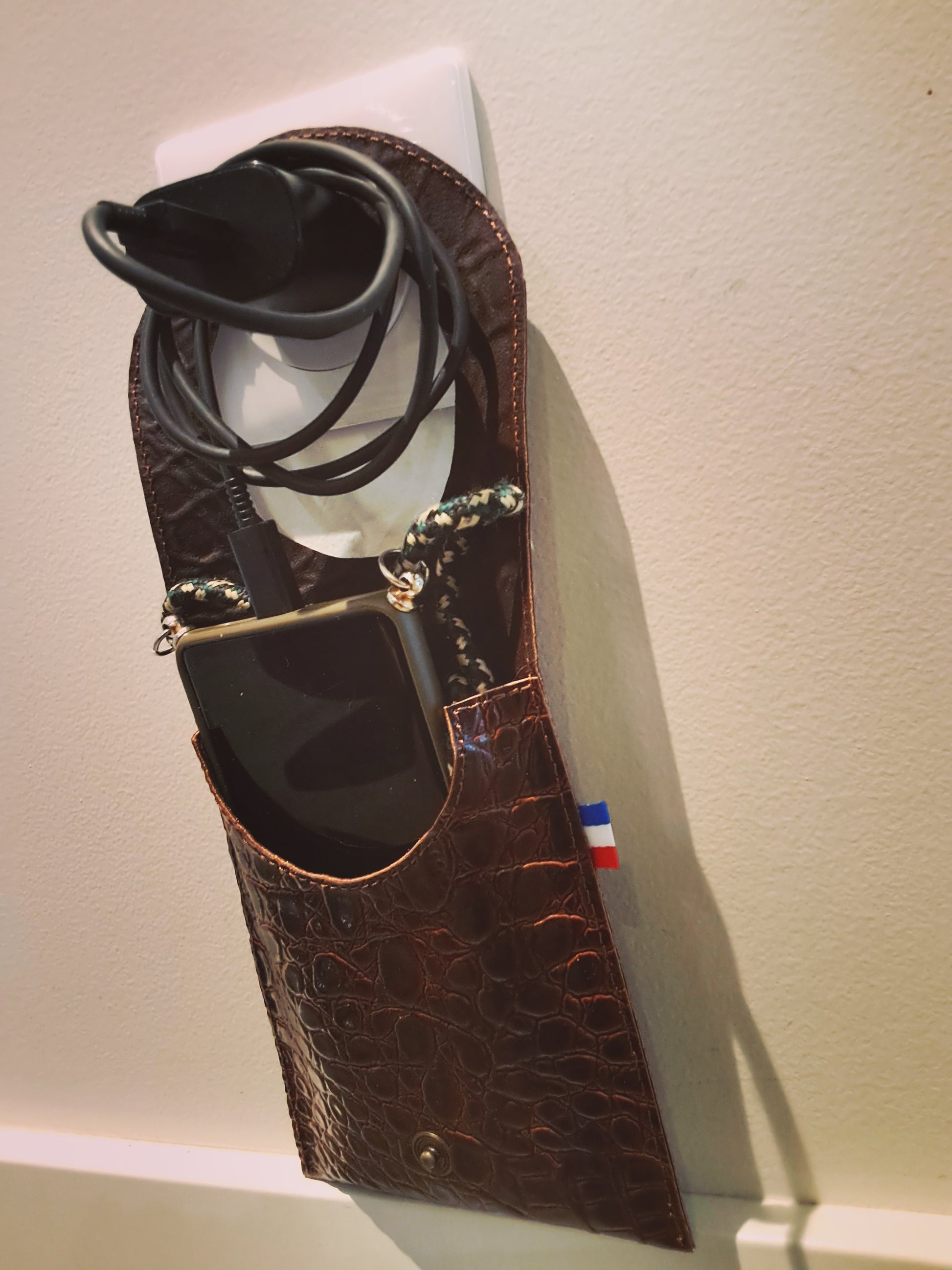 Idéal pour ranger le chargeur et pratique pour mettre son téléphone en charge sur n'importe quelle prise électrique sans laisser son téléphone au sol.
