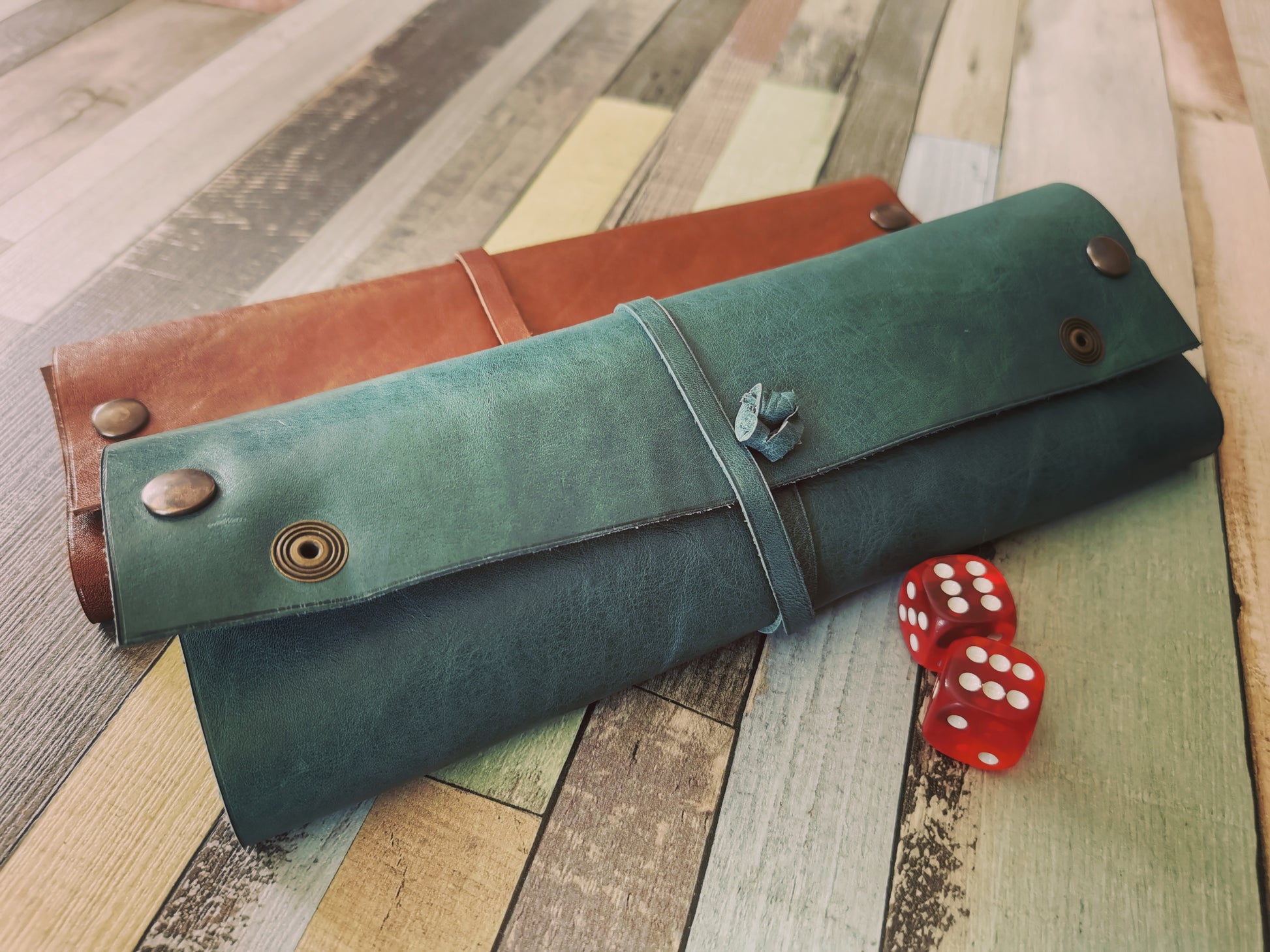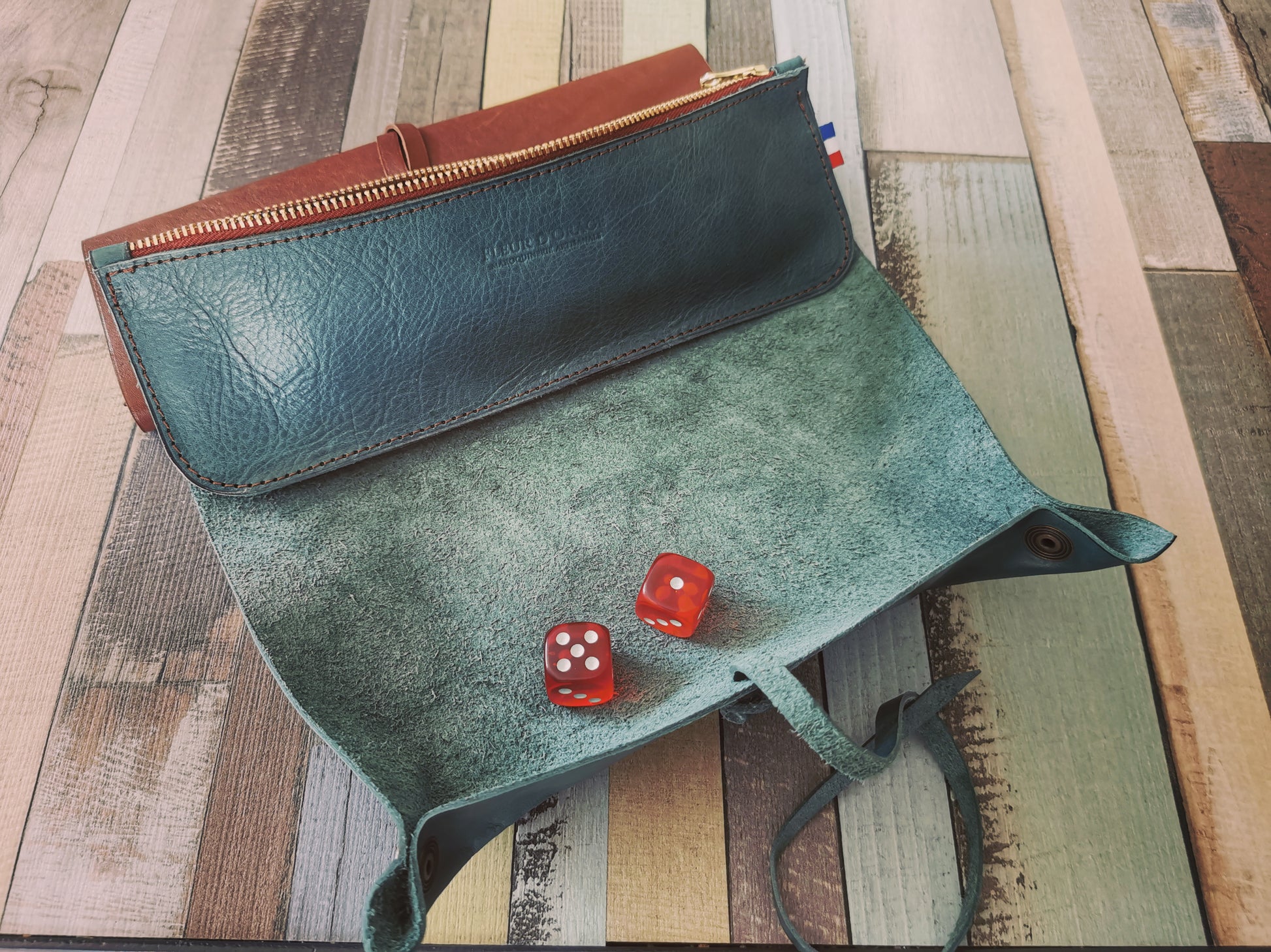 Tapis et trousse pour jeux de dés.